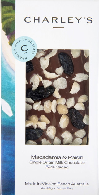 Handcrafted in Mission Beach, Australia, this single-origin milk chocolate features 60% cacao combined with macadamias and raisins for a rich, textured flavor. Made with Australian-grown cocoa and full cream milk, it offers a smooth, creamy experience with natural sweetness and crunch. Ethically sourced ingredients ensure premium quality and authenticity in every bite.