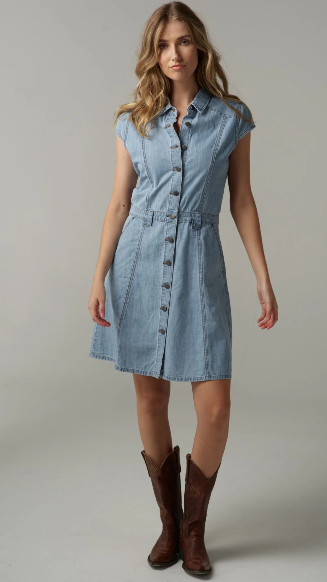 100% Cotton, light weight 6 ounce denim, button through front, fitted styling, belt loops, waist band feature, front pockets, cap sleeves