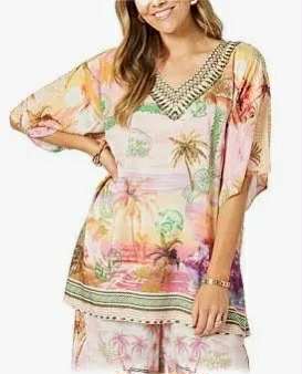 - Featuring a dreamy sunset-toned landscape with palm trees and passport stamp graphics, this top brings vacation vibes to any day.