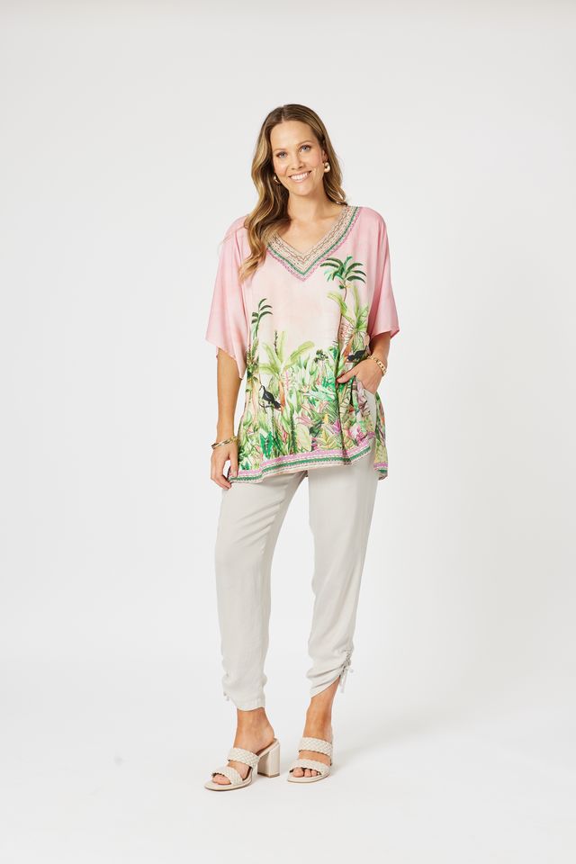Bring the party and the parrots with the Hammock & Vine Toucan V-Neck Top in Pink – a playful pop of colour that’s equal parts tropical and tasteful. Featuring a statement toucan print on a vibrant pink base, this top is made for those who like their fashion fun, flattering, and full of personality.