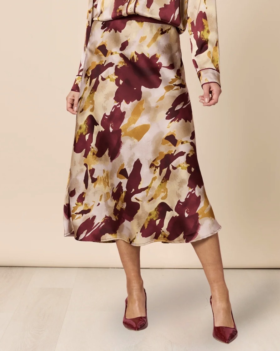 • Crafted from a soft satin fabric with a beautiful drape and gentle sheen, this midi-length skirt features an artful abstract floral print in rich tones of shiraz, gold, and champagne.