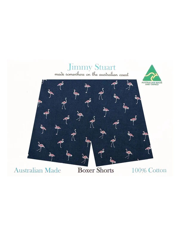 Australian Made Cotton Boxer Short featuring a vibrant pink flamingos abstract design, perfect for a unique and playful touch. Designed with a fake fly front and an elasticated waistband for a comfortable fit. Crafted from high-quality cotton for breathability and durability. Composition & Care: Cotton, Cold wash, Do not tumble dry.