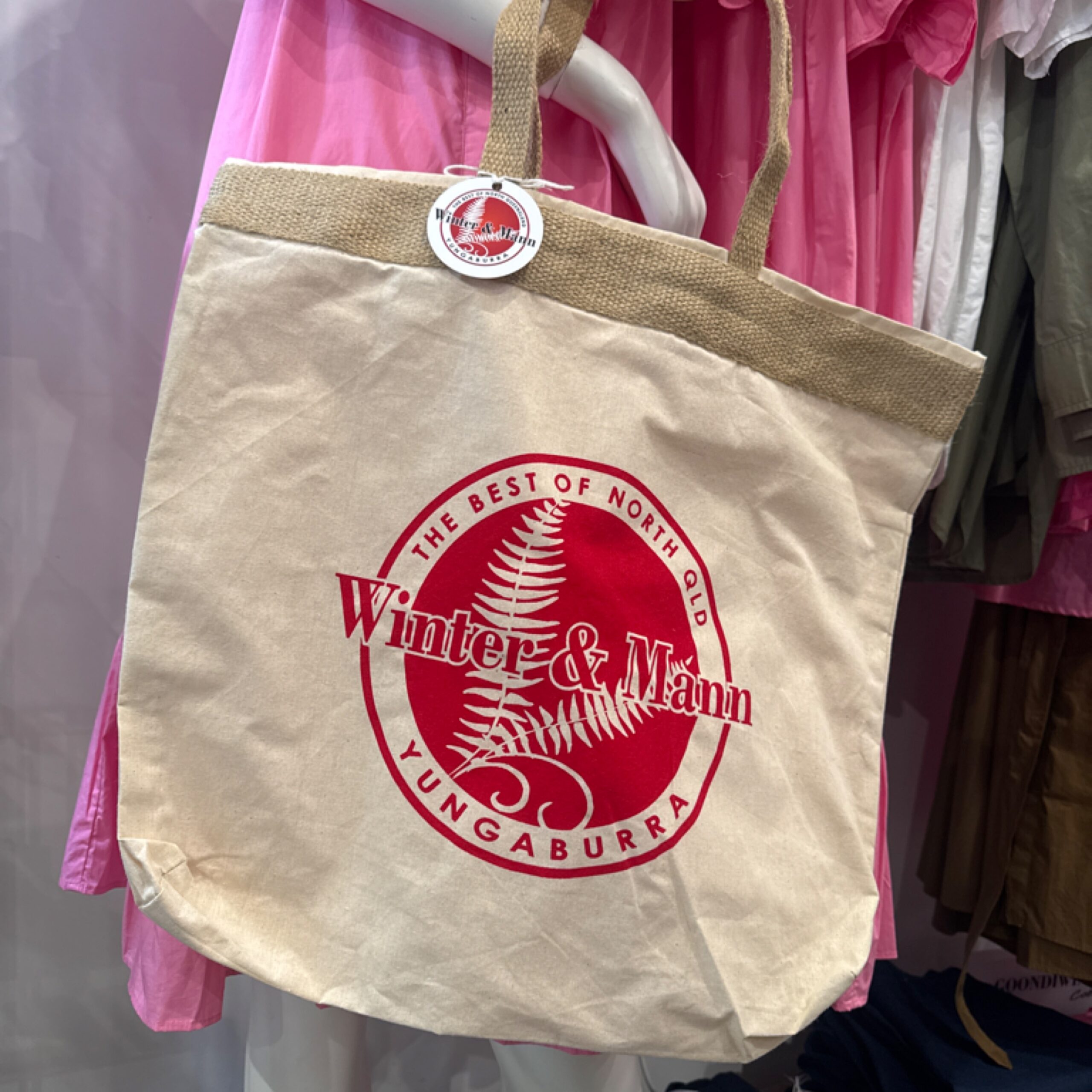 The Winter & Mann cotton tote bag is crafted from durable material and features a versatile design with a spacious interior, ideal for daily essentials or shopping needs.